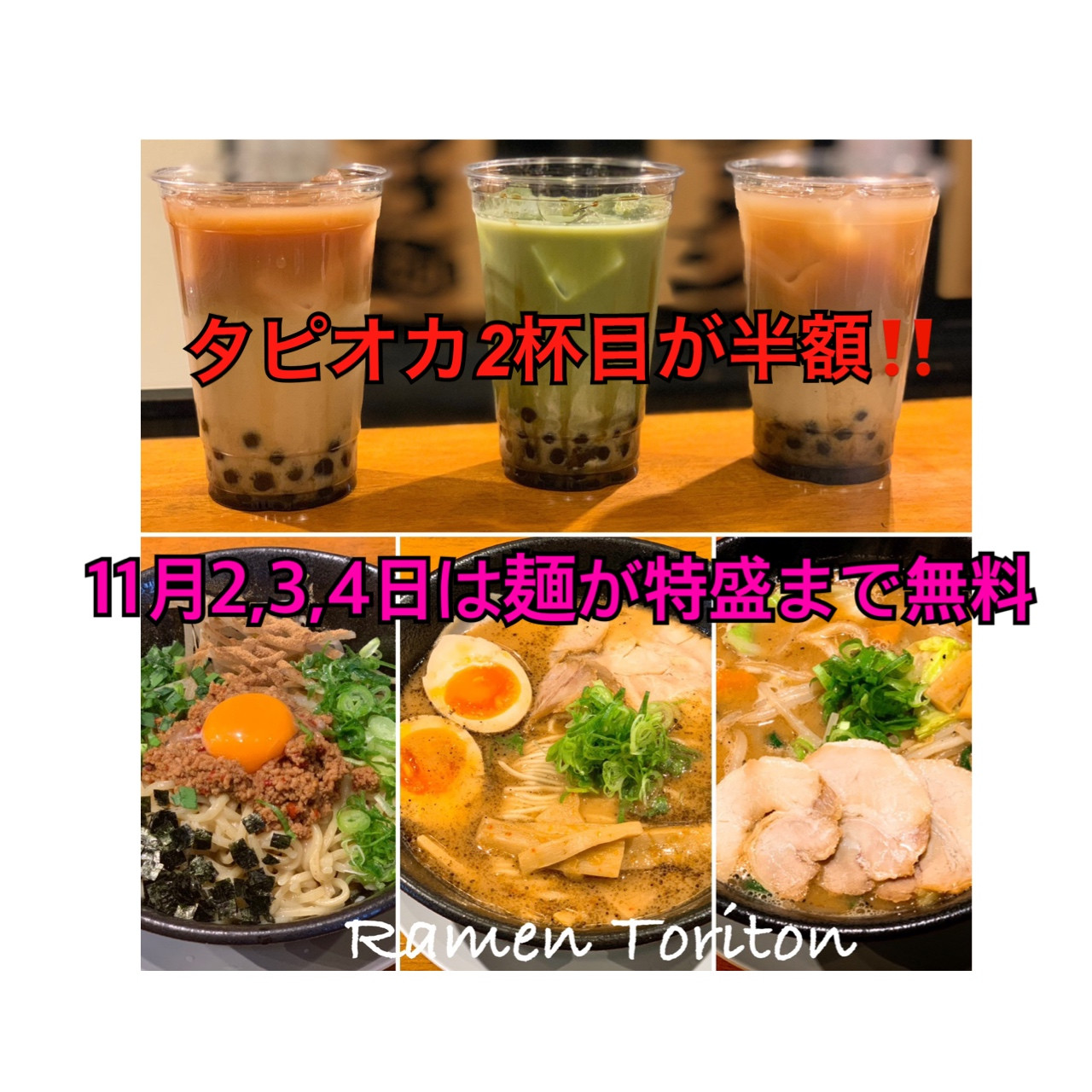 京都伏見稲荷でオススメラーメン屋とタピオカ・ラーメントリトン 2019/11/02 あ あ 11月2,3,4日期間限定 11月2,3,4日期間限定 11月2,3,4日は麺が特盛まで無料です‼️タピオカは2杯目安い方が半額に‼️実質1杯につき337〜になります???